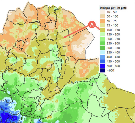Esta función en GeoCLIM ayuda a responder preguntas como, ¿cuáles son los valores bajos/altos (por ejemplo, percentiles 15/90) en la serie temporal? (Figura 4-14). El Cuadro 4.2 muestra la serie temporal del total estacional del FMAM para el período 1981-2017 para el punto (A) de la Figura 4-14. El resultado de la función PERCENTIL.EXC en Excel muestra que el percentil 20 es = 105.