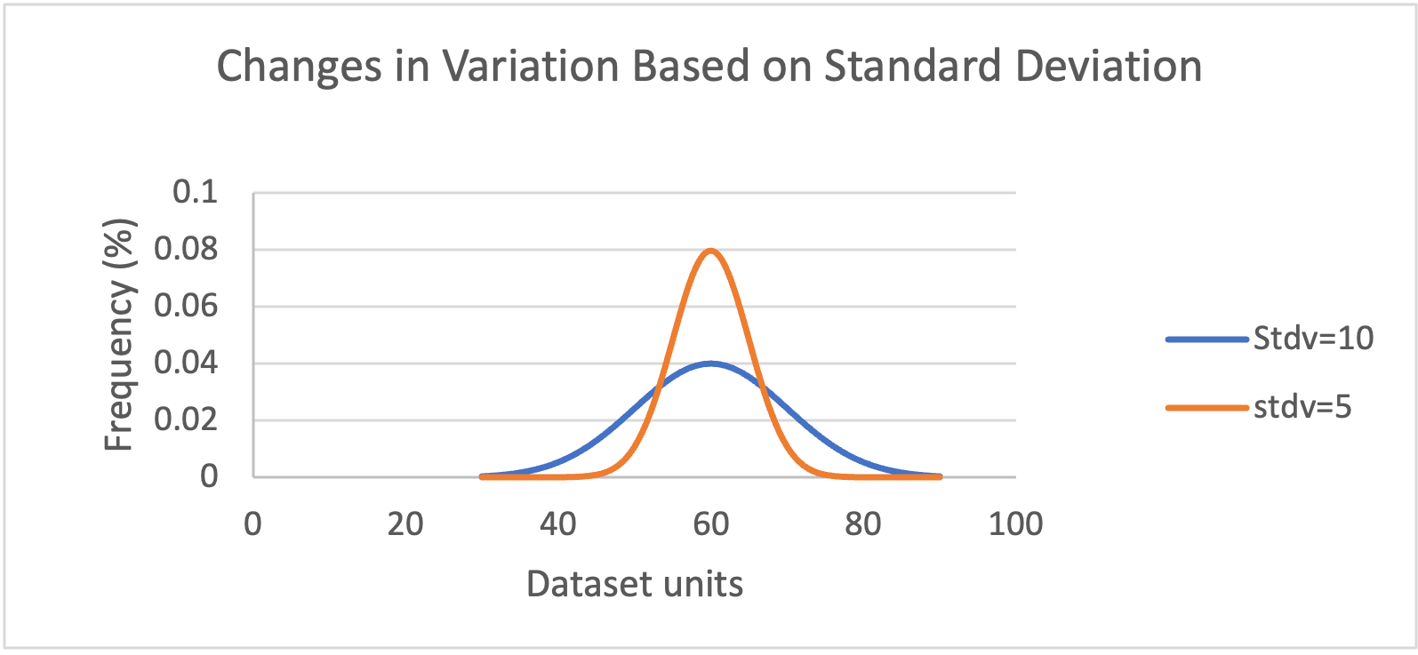 Figura 4-7 La distribución de dos conjuntos de datos con la misma media y diferente DE. La línea naranja muestra una DE baja (stdv=5), lo que indica una baja variabilidad dentro de los datos; los valores están más cerca de la media. La línea azul muestra la distribución de un conjunto de datos más variable (stdv=10).