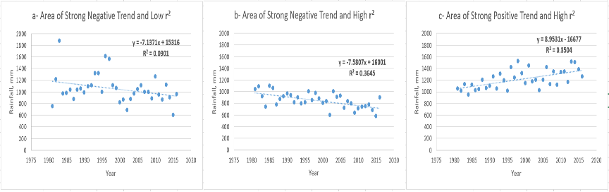 La Figura 4-11 muestra los resultados del método de análisis de tendencias para la precipitación total anual en Etiopía para el período 1981 – 2016, utilizando las Estimaciones mejoradas de lluvia (IRE); consulte el capítulo 10 sobre cómo crear datos IRE. La Figura 4-11 (1) muestra la pendiente de la línea de regresión, o la tendencia de cada píxel en mm/década de lluvia creciente (verde-azul) o decreciente (rosa-rojo). La leyenda muestra estos resultados por década (10 años). La Figura 4-11 (2) muestra el coeficiente de determinación (r-cuadrado o r2) (multiplicado por 100) de la regresión lineal entre la variable y el tiempo como indicación de la confiabilidad de la tendencia. Es importante utilizar ambos mapas para llegar a una conclusión sobre las tendencias en un área. Por ejemplo, los puntos a, b y c muestran tres sitios con tendencias fuertes y r2 diferentes.