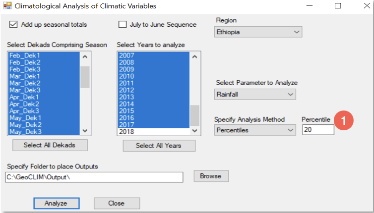 Seleccione los períodos que componen una temporada de interés en el panel izquierdo. El período de datos (pentadas, decadias o meses) se basa en el conjunto de datos climáticos seleccionado. En este caso, el período de datos es de 10 días totales (decadias) (Figura 4-2 (7)).