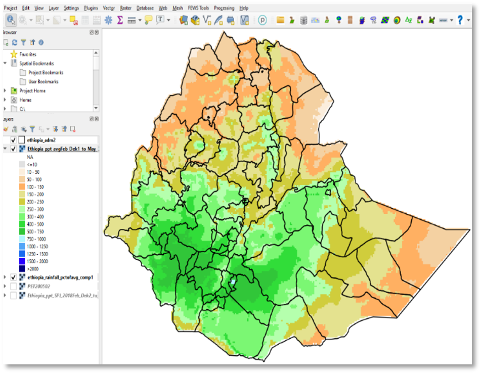 El método de análisis Average calcula el valor promedio temporal para cada píxel durante un período específico, como el mes de mayo, la tercera decadia o una temporada (mayo-junio-julio), utilizando los años y la región seleccionados. La Figura 4-5 muestra la precipitación promedio utilizando datos CHIRPS para el período de mayo a julio de 1981 a 2013, en la región seleccionada (EAC). En otras palabras, el mapa representa el promedio total de la precipitación de mayo-junio-julio entre 1981 y 2013.