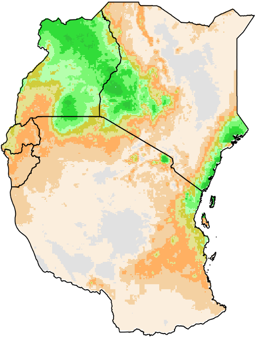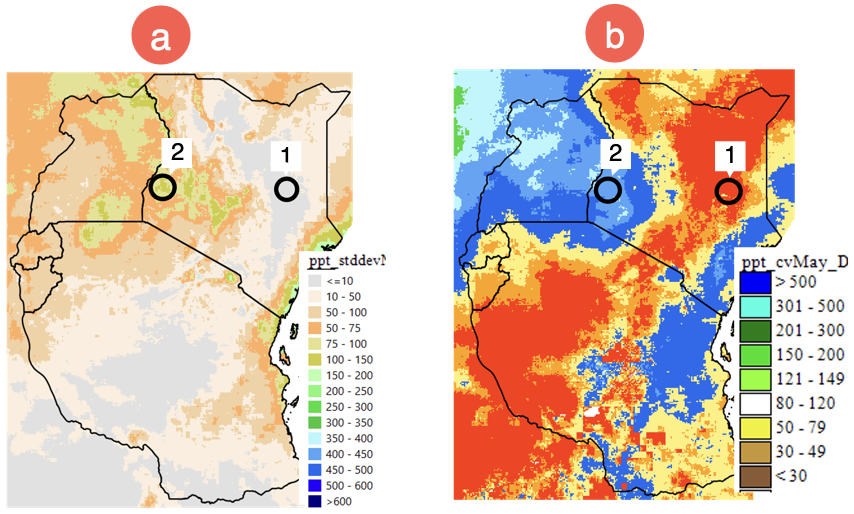 FEWS Tools proporciona dos métodos diferentes para estimar la variabilidad. La desviación estándar (SD) muestra la variabilidad dentro de la serie temporal a lo largo de los años seleccionados para cada píxel, mientras que el coeficiente de variación (CV) muestra la SD como porcentaje del promedio, lo que facilita la comparación de la variabilidad entre regiones.