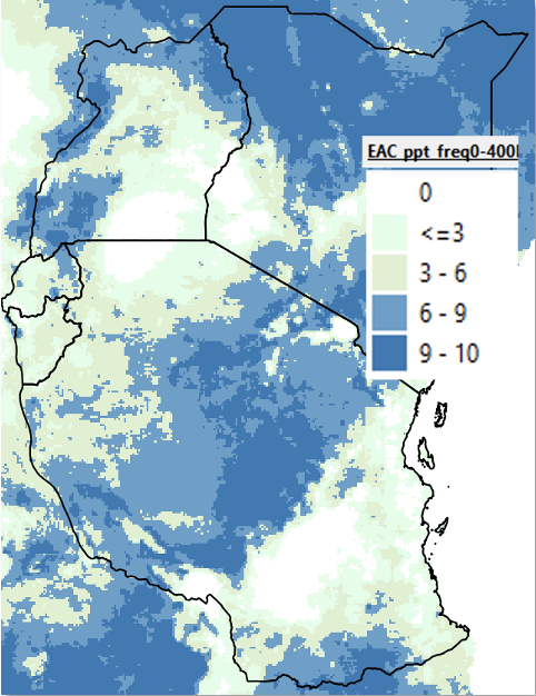 El método de análisis de Frecuencia en el GeoCLIM Climatological Analysis module (Figura 4-15) nos da el número de veces que ha ocurrido un rango de valores en la serie de tiempo. El método de Frecuencia ayuda a responder preguntas como: “¿Cuántas veces la precipitación estacional total ha sido inferior a 400 mm, en el período 1981-2020?” Responder este tipo de preguntas puede ayudar a los usuarios a decidir si un área es adecuada para una actividad determinada climáticamente (como cultivar ciertos cultivos o ganado). La leyenda de la Figura 4-16 representa el número de eventos por década (diez años).