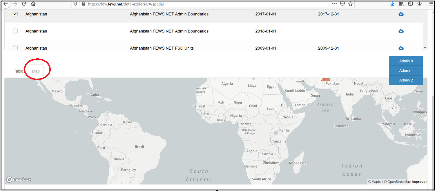 This feature is about implementing the Map tab on the Spatial data domain (https://fdw.fews.net/data-explorer/#/spatial) in FDE. In addition to this, if the user selects one or more Geographic Unit Set Versions and Unit Type, then the Features can be extracted as GeoJSON with queries like: https://fdw.fews.net/api/feature/?format=geojson&unit_set_version=XXX&unit_set_version=XXX , https://fdwdev.fews.net/api/feature/?format=geojson&unit_set_version=XXX&unit_set_version=XXX&unit_type=adminX
