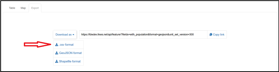 (https://fdw.fews.net/en/admin/spatial/geographicunit/export/?). This was resolved and can now be exported in any formats.
