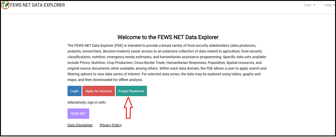 from the log in page of the FDW. This way, users can reset their own passwords, as opposed to requesting Helpdesk support (https://fdw.fews.net/en/).