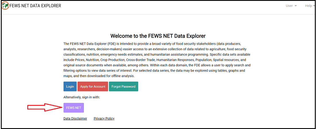 from the login page (https://fdw.fews.net/en/) that authenticate them using their FEWS NET G-Suite accounts .
