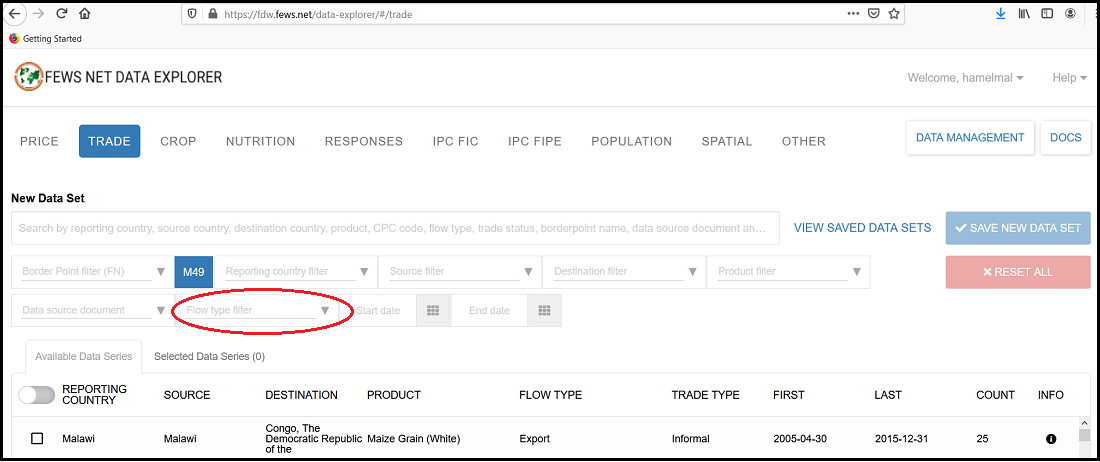 filter to the Trade data domain of the FDE (https://fdw.fews.net/data-explorer/#/trade).