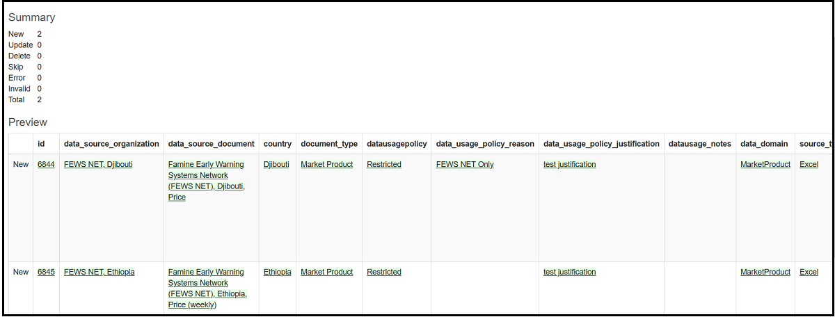 The data source document import (https://fdw.fews.net/en/admin/warehouse/datasourcedocument/import/) has been enhanced to cover the Data Usage Policy and display the following headers in the data source document extract (https://fdw.fews.net/api/datasourcedocument/?format=xlsx):