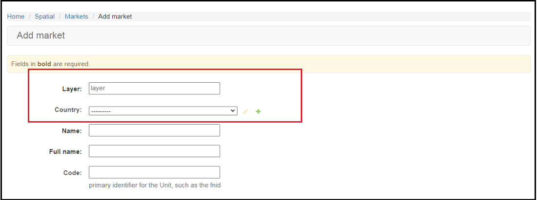 in the market screen i.e (https://fdw.fews.net/en/admin/spatial/market/add/) and in addition to this , theLayer field