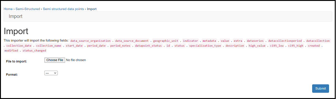3. Semi-Structured Data Point Admin Screen (https://fdw.fews.net/en/admin/semistructured/asisdatapoint/import/)