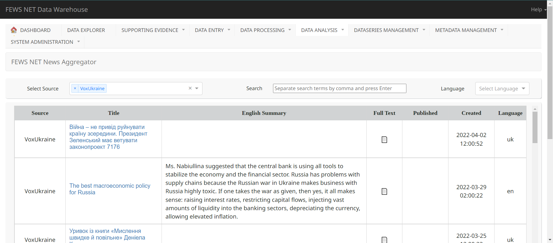 Within the FDW there is a new dashboard that allows users to access news articles from pre-defined news sources. The dashboard includes links to the original articles and their full English text.