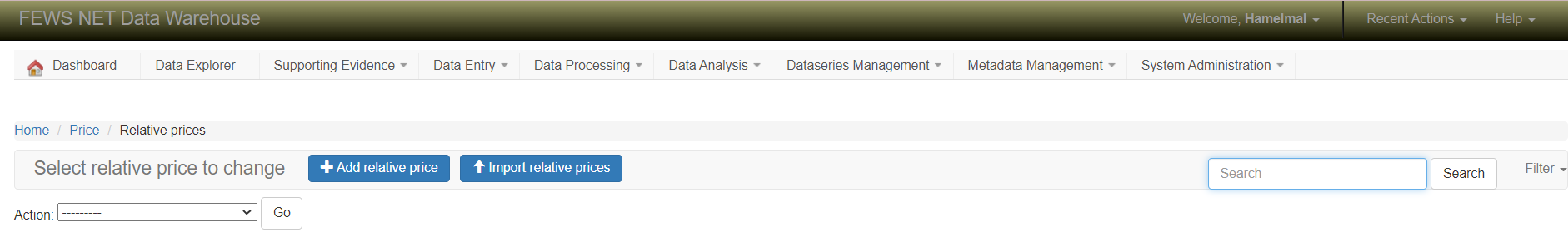 Data Analysis > Calculated Data Sets > Relative Prices > Import relative prices (i.e., https://fdw.fews.net/en/admin/price/priceratio/import/)