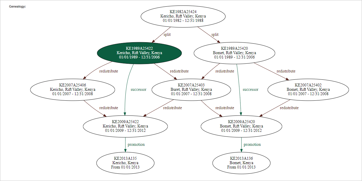 Geographic Units in FDW now contain genealogy charts depicting the relationships of geographic units to each other over time. The relationships chart appears on the Geographic Unit page between the Description and the Features map. Learn more about geographic unit relationships and genealogy charts.
