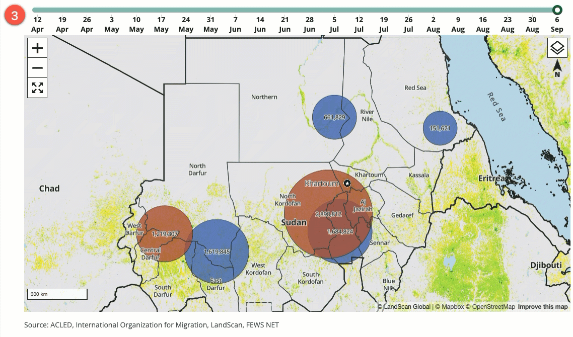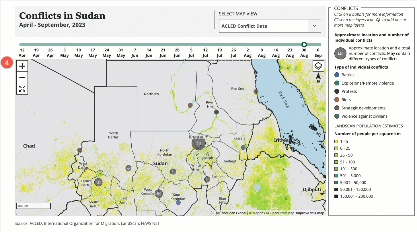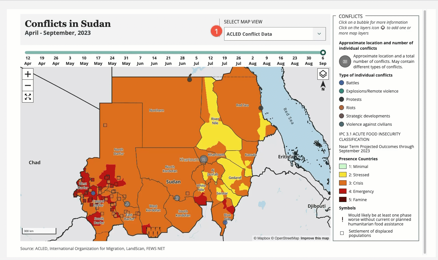 The Sudan Conflict Map uses data from ACLED and IOM to visualize conflict and migration flow in Sudan beginning in April 2023. Users can layer the conflict and migration flow map views onto Visualizations of FIC near term projected outcomes, population data, remote sensing data, and trade flow data for the country.